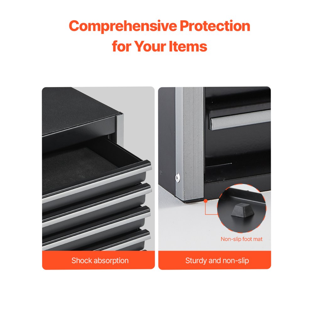 Organización eficiente: La caja de herramientas de metal está diseñada con múltiples capas para maximizar el espacio vertical, lo que permite almacenar más artículos. Los cajones de múltiples capas le permiten clasificar ordenadamente sus artículos para un fácil acceso. El acolchado protector incorporado evita el ruido por deslizamiento o colisiones, lo que brinda protección adicional para sus pertenencias y ayuda a evitar rayones o daños, lo que mejora la seguridad