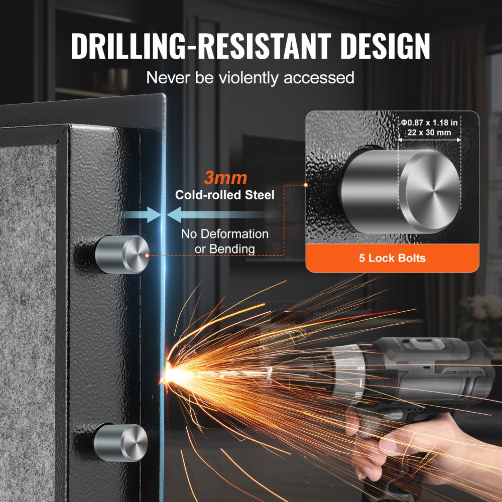 Máxima protección: la caja fuerte está hecha de acero de aleación de alta calidad con una placa de puerta de 3 mm de espesor para garantizar la máxima seguridad. Equipada con 5 pernos de puerta sólidos, brinda una protección superior contra cualquier intento de robo.