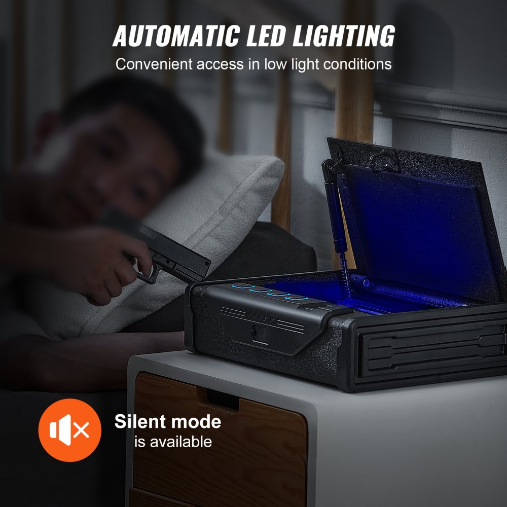Luz LED y modo silencioso: Diseñada pensando en sus necesidades, nuestra caja para armas de fuego incluye iluminación LED para un fácil acceso durante la noche. El modo silencioso le permite recuperar discretamente sus pertenencias sin molestar a los demás.