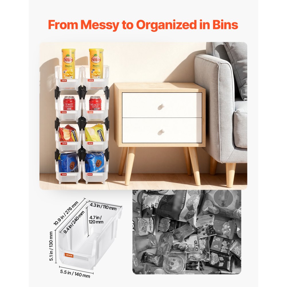 Cajas Apilables de Almacenamiento, 276 x 140 x 130 mm, para Organizar y Almacenar, con Frente Abierto, para Armario, Garaje, Piezas Pequeñas, Suministros de Oficina, Transparentes, 8 uds