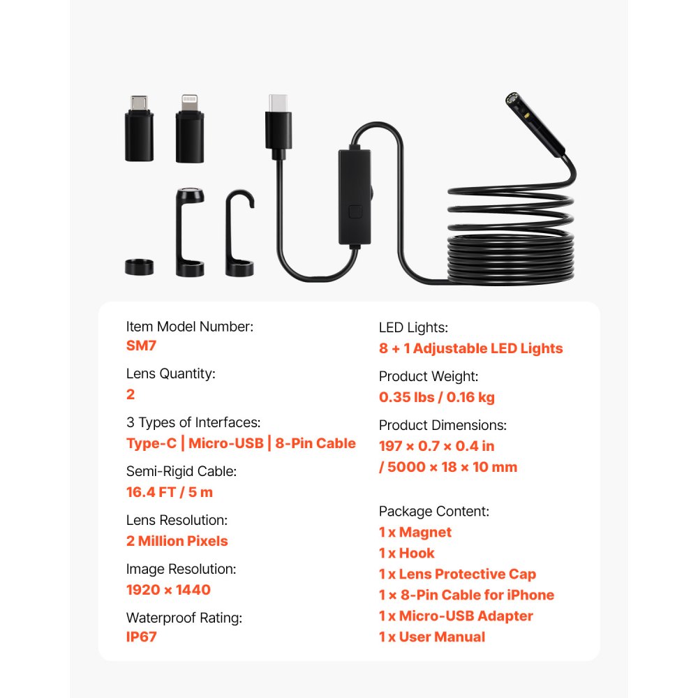 Cámara Endoscópica, Boroscopio Doble Lente para Android e iOS, HD 1920P con 8 Luces LED + 1, Zoom 2X, Cable Flexible de 5 m, Impermeable IP67, para Automóviles y Plomería, 5000 x 18 x 10 mm - Herramientas manuales