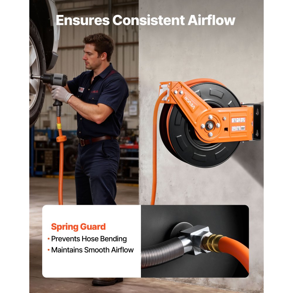 Mangueras enredadas: El carrete retráctil de manguera de aire incluye una manguera de aire de goma de 15 m x 9,5 mm y una manguera de entrada de 1 m para mantener su espacio de trabajo ordenado y sin enredos. Olvídese de las mangueras arrastradas por el suelo, lo que reduce el desgaste y el riesgo de tropiezos para un uso más seguro