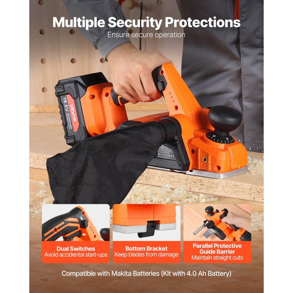 Cepilladora Inalámbrica para Madera, Ancho de Corte 82 mm, 15 000 RPM, con Batería de Litio 4,0 Ah y 18 V, Motor sin Escobillas, Profundidad de Corte Ajustable y Bolsa de Recogida de Polvo - Herramientas manuales