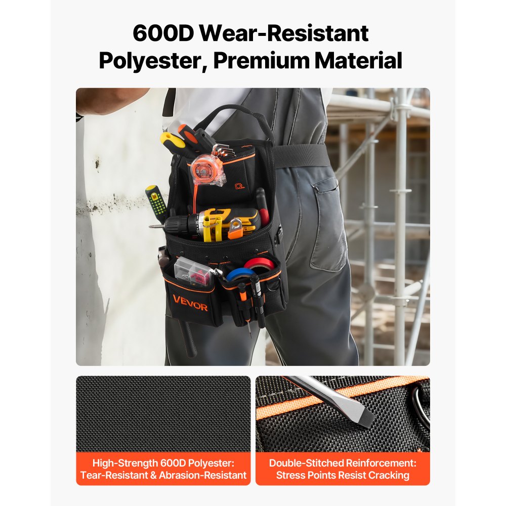Resistente a la abrasión y al desgarro: Nuestro cinturón portaherramientas para carpinteros, fabricado con poliéster 600D reforzado con costuras dobles y bordes ribeteados, es resistente al desgaste, al desgarro, a la deformación y al enrollamiento, incluso bajo cargas pesadas, con un juego completo de herramientas o en el ajetreo de una obra. Diseñado para profesionales y aficionados al bricolaje