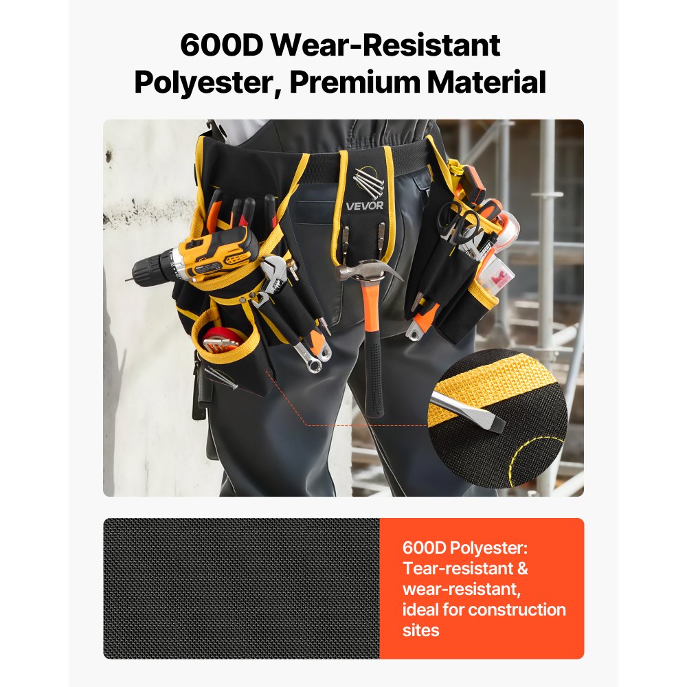Resistente a la abrasión y al desgarro: Nuestro cinturón portaherramientas para carpinteros, fabricado con poliéster 600D reforzado con costuras dobles y bordes ribeteados, es resistente al desgaste, al desgarro, a la deformación y al enrollamiento, incluso bajo cargas pesadas, con un juego completo de herramientas o en el ajetreo de las obras. Diseñado para profesionales y aficionados al bricolaje