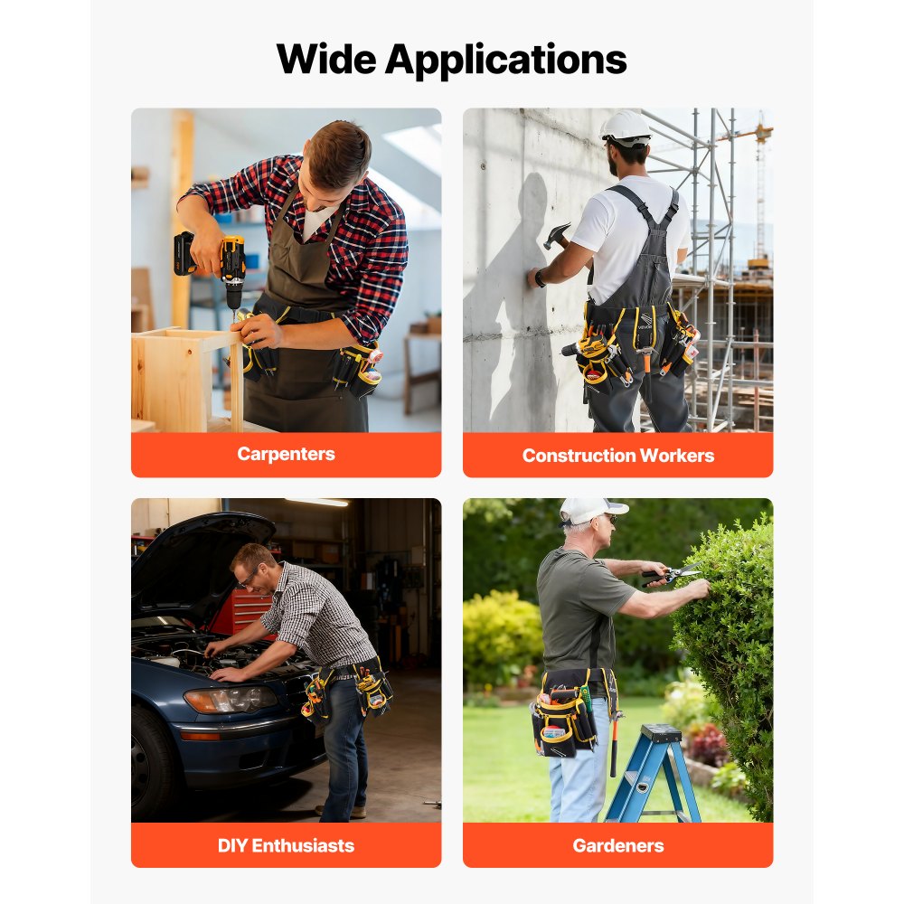 Uso versátil: Este cinturón portaherramientas es ideal para carpinteros, electricistas, obreros de la construcción y aficionados al bricolaje, ya que mantiene las herramientas organizadas y las manos libres. Es adecuado para trabajos pesados o reparaciones domésticas y ofrece una funcionalidad integral y eficiente