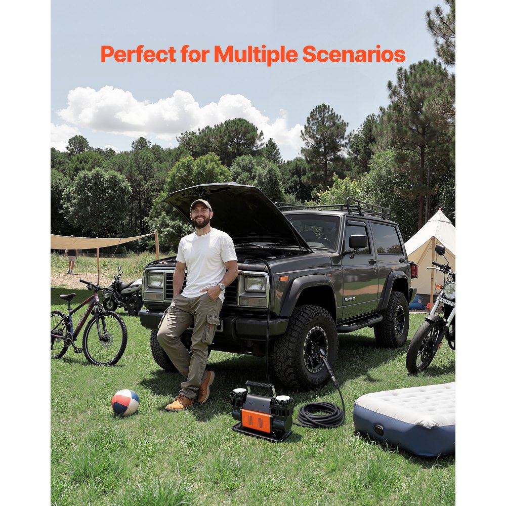 Paquete completo: Incluye compresor de aire de doble cilindro de alta resistencia con cable de alimentación de 60 cm + manómetro digital con inflador de neumáticos + manguera de aire de goma de 7,8 m + 3 adaptadores de boquilla + adaptador con bloqueo de pulgar + bolsa de herramientas portátil. Siempre listo para la aventura todoterreno