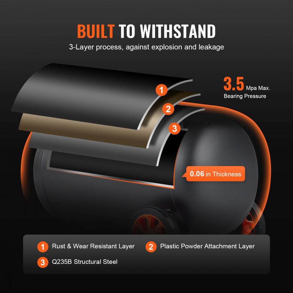 Diseñado para resistir: Nuestro compresor de aire eléctrico está construido a partir de un proceso de 3 capas: capa resistente al óxido y al desgaste, capa de fijación de polvo de plástico y acero estructural Q235B que proporciona durabilidad y máxima resistencia al óxido. La presión máxima de los cojinetes de 3,5 Mpa y la construcción de soldadura sin costuras garantizan la capacidad de soportar explosiones y fugas.