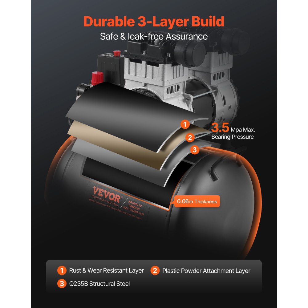 Diseñado para resistir: nuestro compresor de aire eléctrico está construido con un proceso de 3 capas: capa resistente al óxido y al desgaste, capa de fijación de polvo plástico y acero estructural Q235B que brinda durabilidad y máxima resistencia al óxido. La gran presión de los cojinetes y la construcción de soldadura sin costuras garantizan la capacidad de soportar explosiones y fugas.