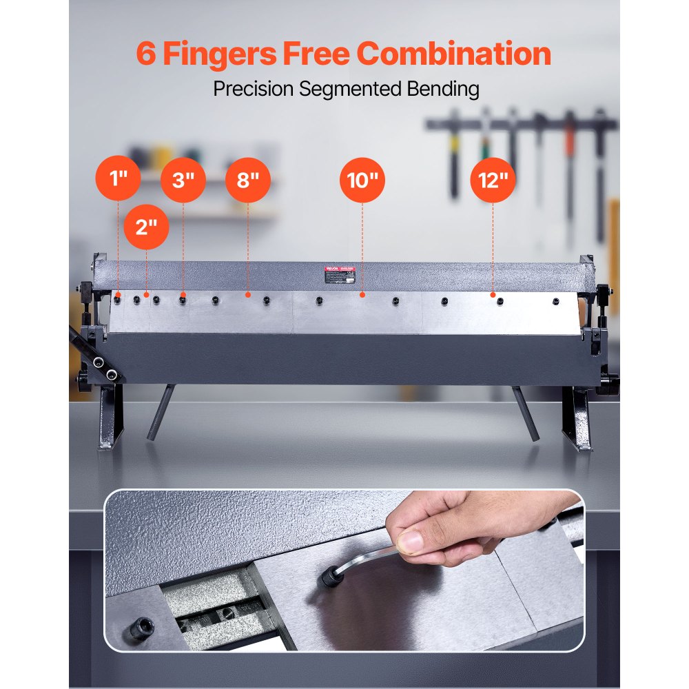 Matrices de doblado modulares: Equipadas con seis dedos de segmento diferentes (1/2/3/8/10/12 pulgadas), la dobladora de chapa metálica permite un doblado personalizado para manejar proyectos complejos como gabinetes eléctricos, carcasas de instrumentos y conductos de ventilación.
