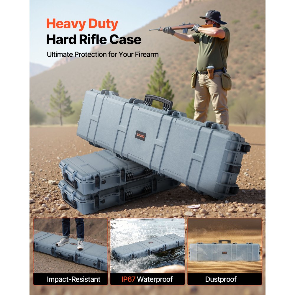 Resistente al agua y al polvo IP67: Este estuche rígido para rifle cuenta con un exterior robusto y resistente a golpes con protección IP67 contra el agua y el polvo. Garantiza un diseño completamente sellado que impide la entrada de agua, protegiendo sus armas de fuego de las inclemencias del tiempo