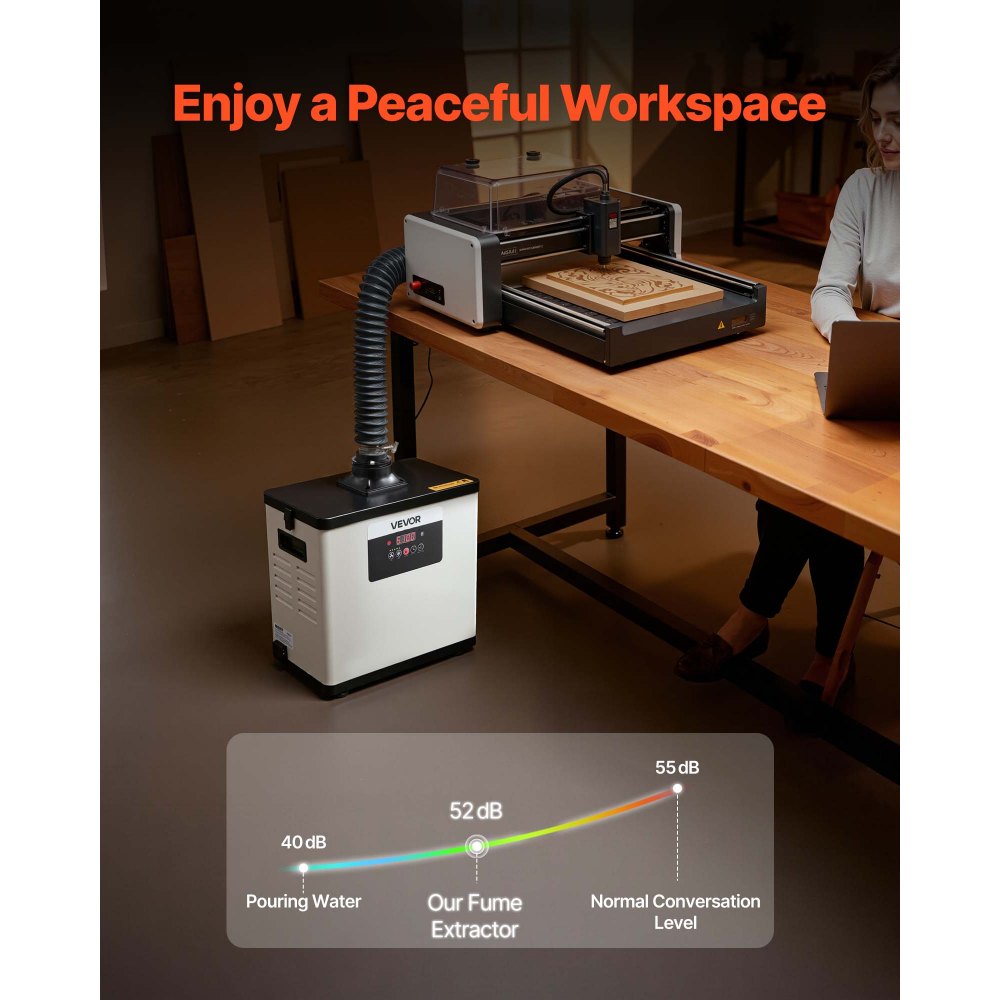 Gran potencia de succión: Gracias a un potente motor sin escobillas de 145 W, este extractor de humos de soldadura ofrece una potente succión de hasta 510 m³/h. Absorbe eficazmente los humos de grabado láser e impresión 3D, manteniendo el aire de su espacio de trabajo más limpio