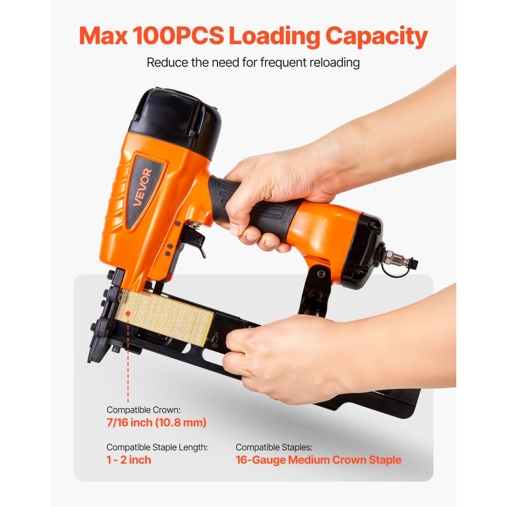 Gran capacidad de carga: Nuestra grapadora neumática cuenta con un cargador de gran capacidad con capacidad para hasta 100 grapas a la vez, lo que permite un trabajo eficiente sin necesidad de recargas frecuentes. Su carcasa de aleación de aluminio proporciona mayor resistencia y durabilidad
