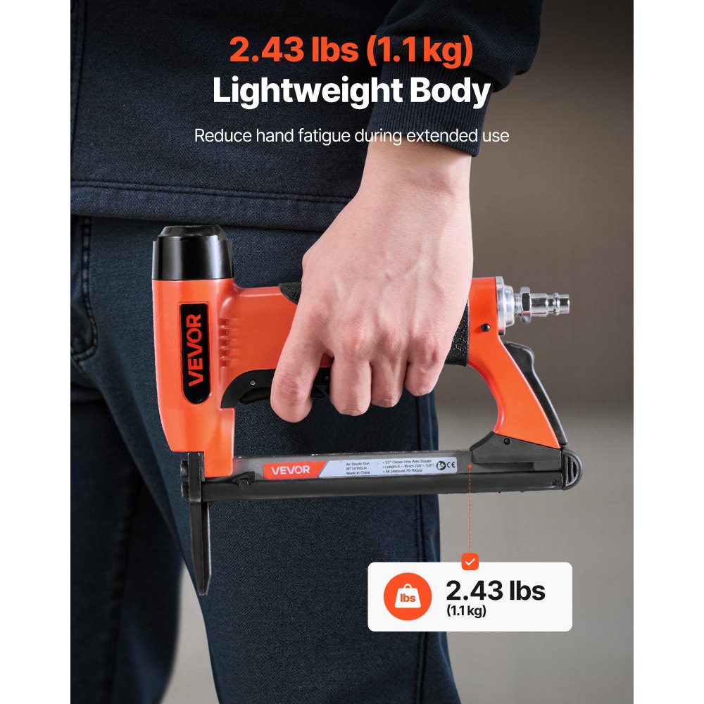 Agarre cómodo: Equipada con un mango de goma ergonómico antideslizante y una construcción liviana, esta grapadora neumática liviana ofrece un mejor control, así como un agarre suave y seguro que reduce la fatiga de la mano durante el uso prolongado