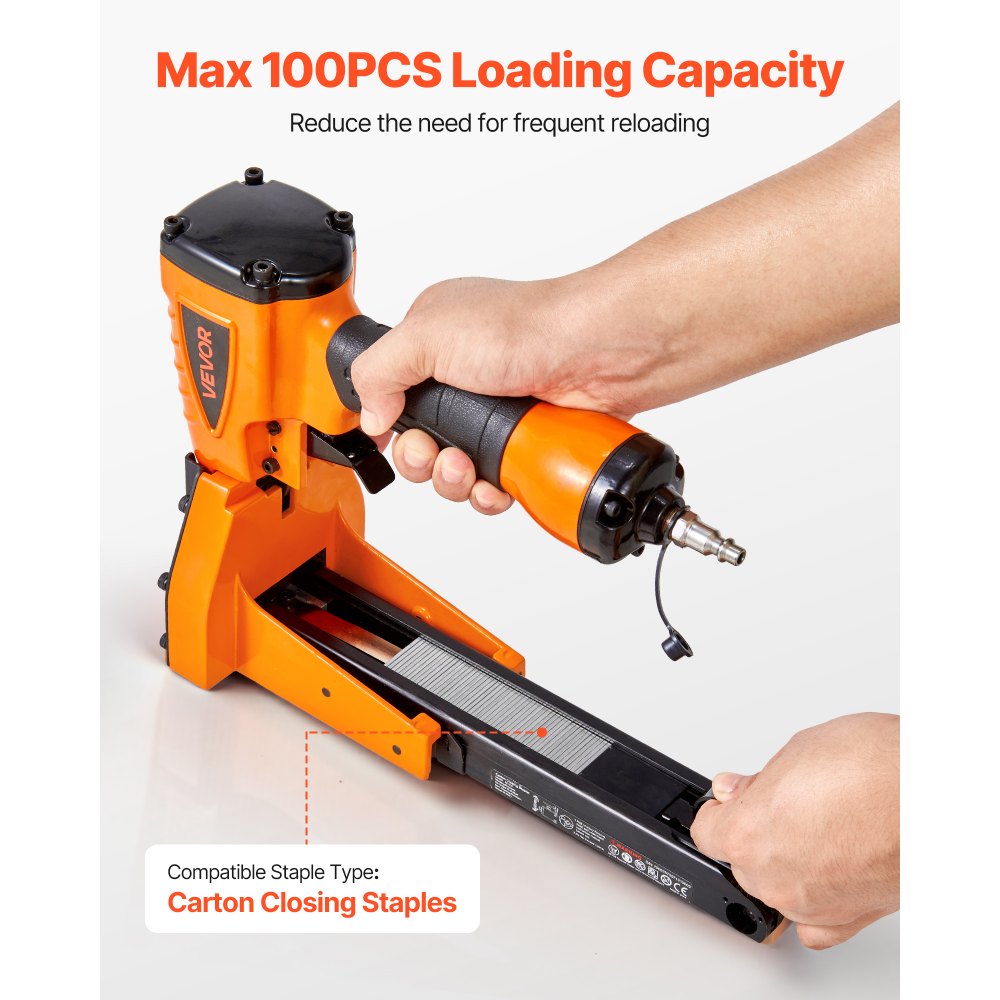 Gran capacidad de carga: Nuestra grapadora neumática para cajas de cartón cuenta con un cargador de gran capacidad con capacidad para hasta 100 grapas, lo que permite un trabajo eficiente sin recargas frecuentes. Su cuerpo de aleación de aluminio le proporciona alta resistencia y durabilidad