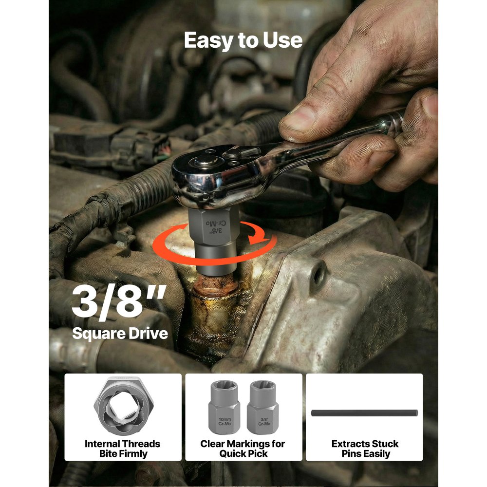 Construido para durar: Fabricado en acero CRMO de alta calidad con dureza HRC50-55, el juego de extractores de pernos está diseñado para resistir el desgaste, la torsión y la deformación. Es ideal para uso frecuente en garajes, talleres y lugares de trabajo donde la durabilidad es fundamental