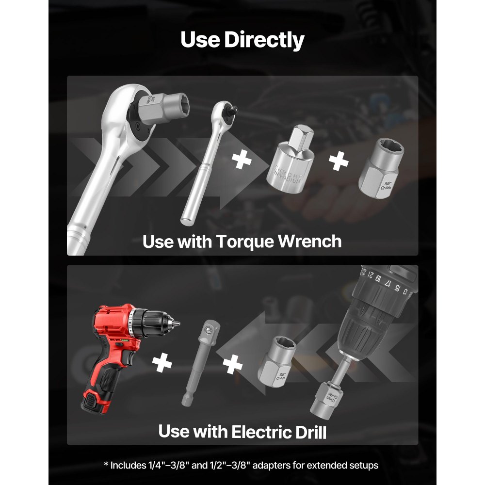 Compatible con más herramientas: Este juego de extractores de tornillos y tuercas es compatible con llaves dinamométricas y taladros eléctricos. Los adaptadores de 6 mm a 9 mm y de 12 mm a 9 mm incluidos permiten configuraciones flexibles para cambiar de herramienta fácilmente