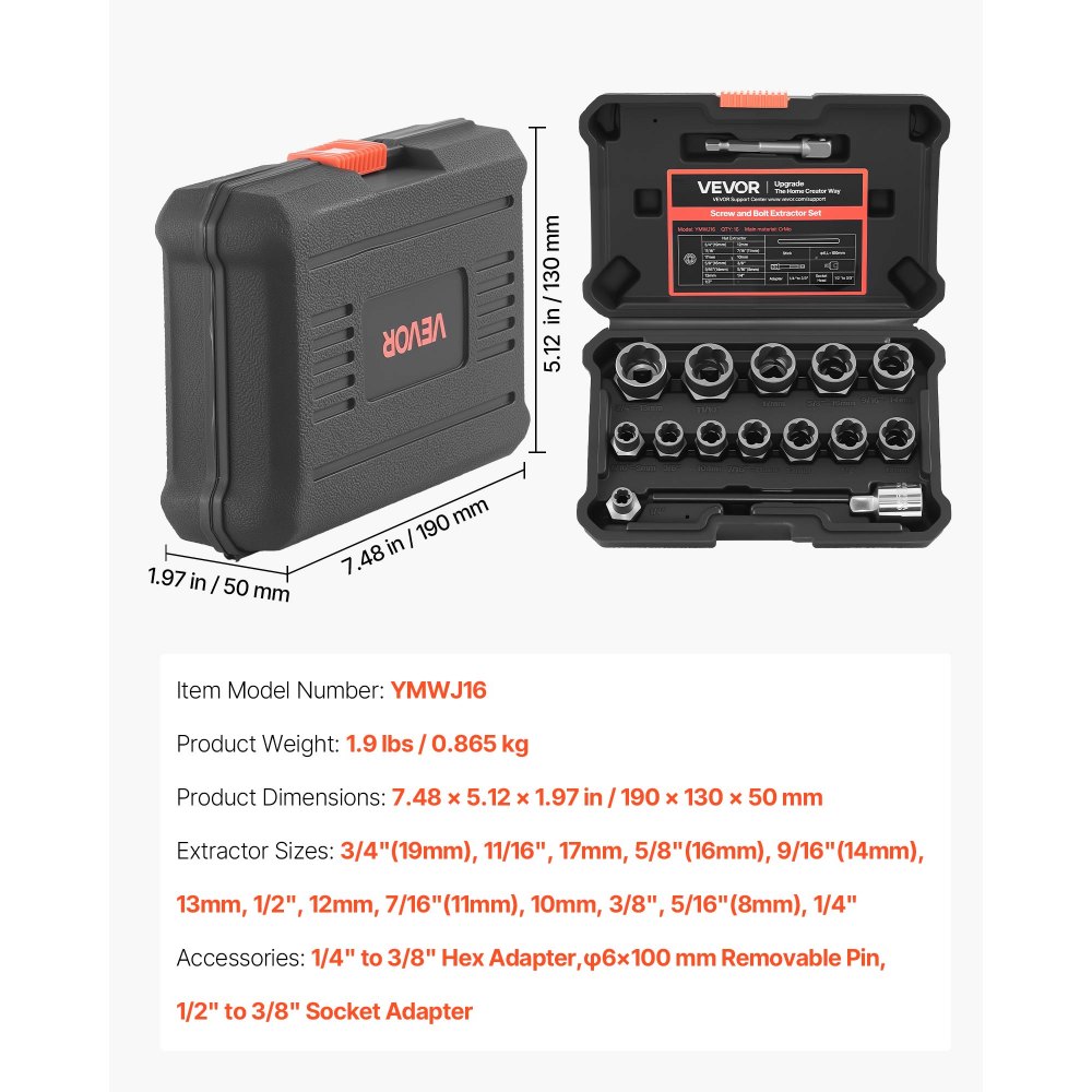 Kit completo de extractor de pernos: Incluye 13 extractores (19 mm, 17 mm, 16 mm, 14 mm, 13 mm, 11 mm, 12 mm, 11 mm, 10 mm, 8 mm, 8 mm y 6 mm), además de un adaptador de 6 mm a 9 mm, un punzón de 6 mm y un adaptador de 12 mm a 9 mm