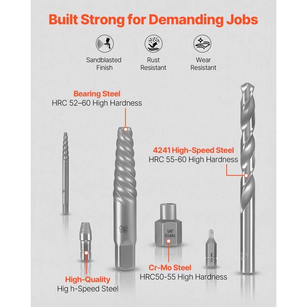 Diseñado para reparaciones exigentes: Este kit de extractor de pernos rotos está fabricado con aceros cuidadosamente seleccionados y niveles de dureza controlados para equilibrar el agarre, la resistencia y la durabilidad bajo torsión repetida