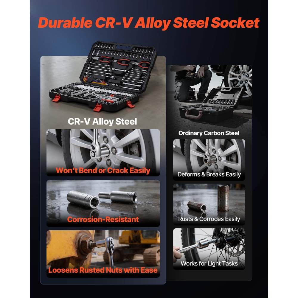 Fabricados para durar: Los dados están fabricados con acero CR-V de alta calidad, lo que garantiza una larga duración con excelente resistencia a la oxidación y al desgaste. Ya sea para reparaciones domésticas o uso profesional, este juego de herramientas para mecánicos ofrece una fiabilidad en la que puede confiar