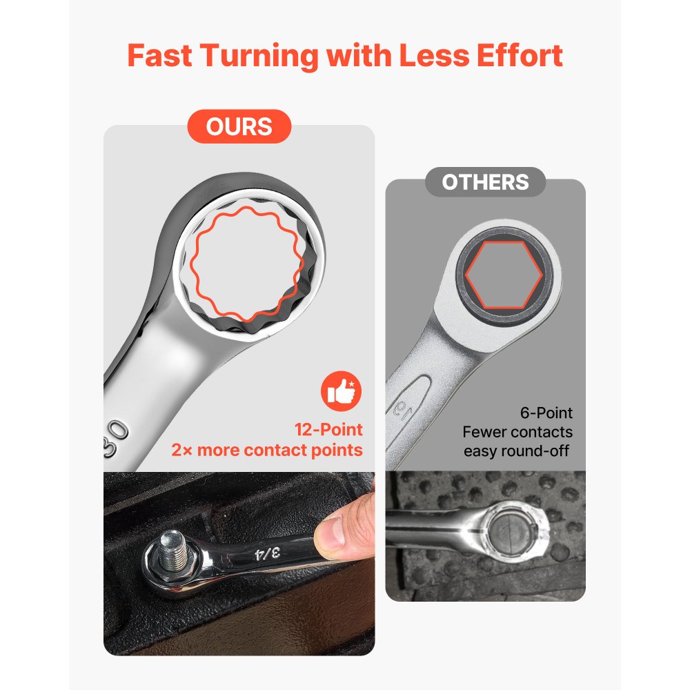Agarre estable con extremo de 12 puntas: El extremo de estrella de 12 puntas mejora el contacto con los sujetadores para reducir el deslizamiento y el desgaste al apretar o aflojar. Este juego de llaves combinadas garantiza un giro suave y un mejor control, incluso con tuercas desgastadas o parcialmente redondeadas