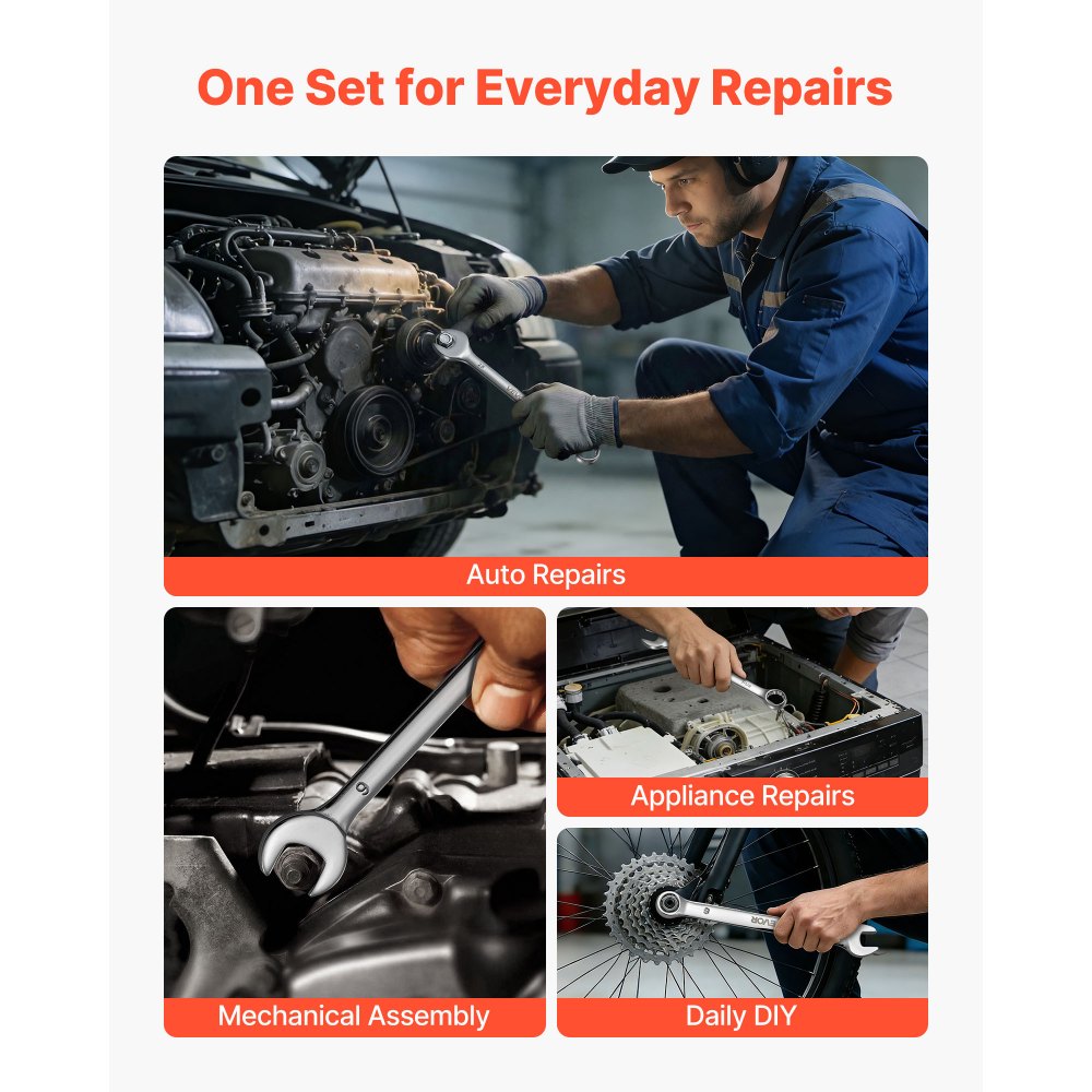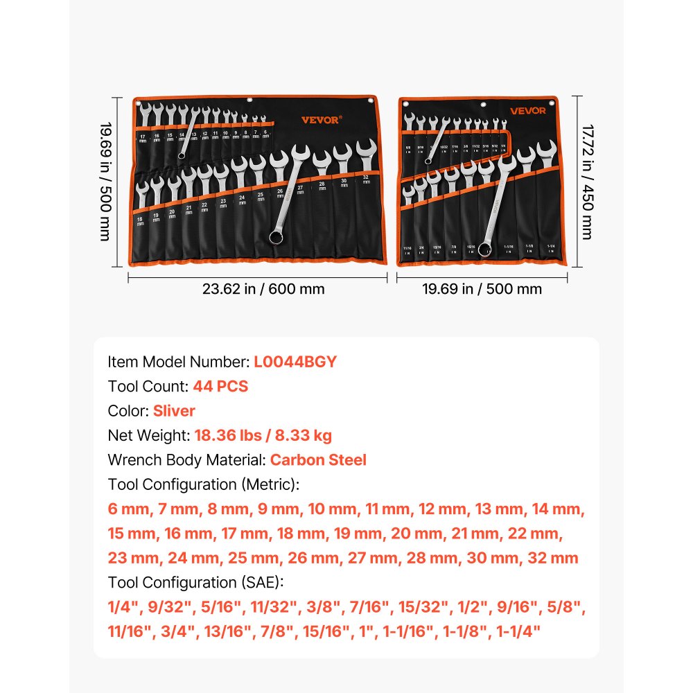 Amplia gama de tamaño: El juego de llaves combinadas de SAE y métricas de 44 piezas incluye llaves de 6 a 32 mm y de 1/4" a 1-1/4", que son los tamaños comunes para reparación de automóviles, ensamblaje mecánico, mantenimiento de electrodomésticos y proyectos de bricolaje