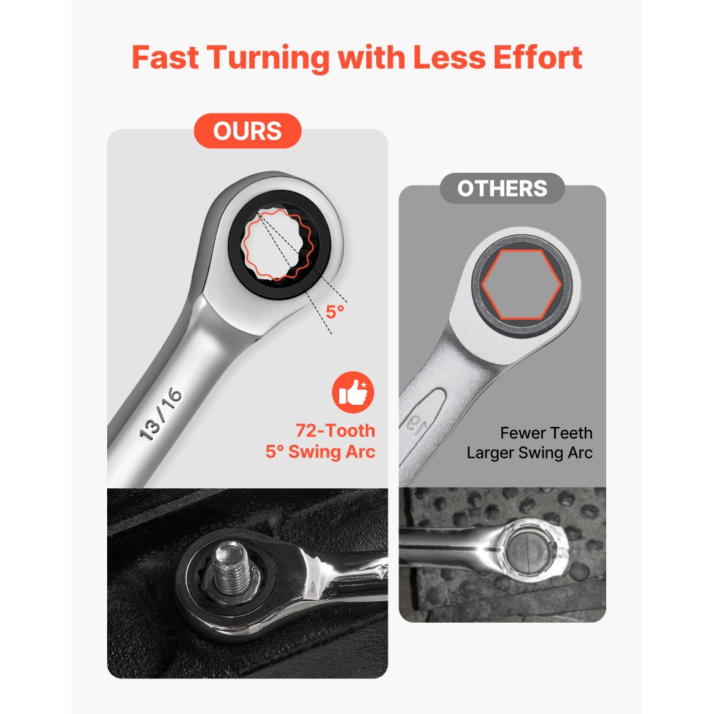 Giro suave para un trabajo rápido: La carraca de 72 dientes y el diseño de microoscilación de 5° reducen el movimiento de la mano para un control suave en espacios reducidos. Este juego de llaves de carraca cuenta con un agarre antideslizante y un engranaje preciso para un giro más fácil e ininterrumpido
