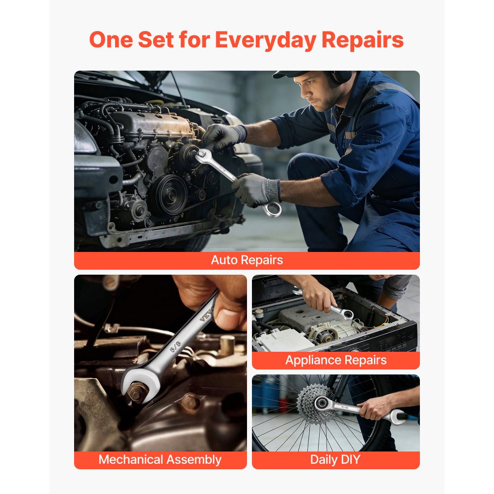 Diseñado para un uso diario duradero: Este juego de llaves de trinquete está fabricado con un cuerpo de acero reforzado y una cabeza de trinquete de acero cromo vanadio para mayor resistencia y fiabilidad. El acabado antioxidante garantiza un rendimiento fiable incluso en entornos húmedos o aceitosos