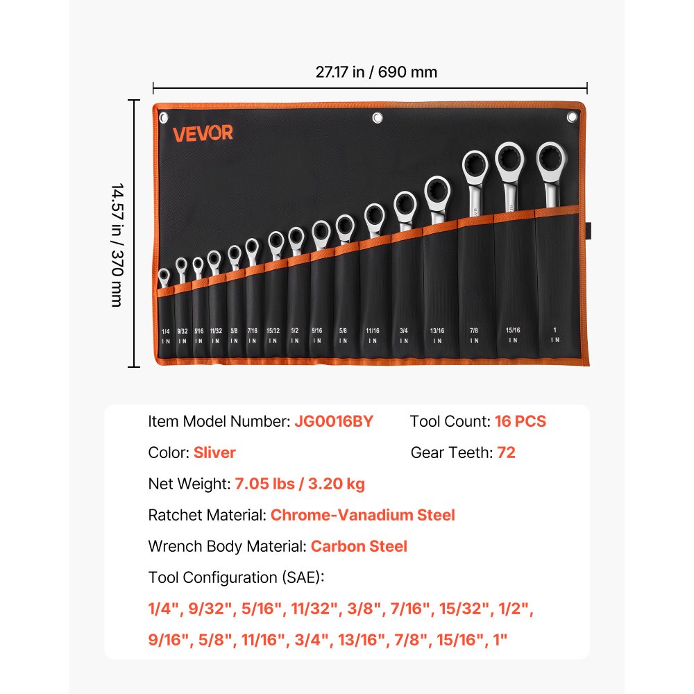 Gama completa de tamaños para reparaciones diarias: Nuestro juego de llaves de trinquete de SAE de 16 piezas incluye llaves de 1/4, 9/32, 5/16, 11/32, 3/8, 7/16, 15/32, 1/2, 9/16, 5/8, 11/16, 3/4, 13/16, 7/8, 15/16, 1 pulgada, ideal para mantenimiento del hogar, ensamblaje de maquinaria y proyectos de bricolaje