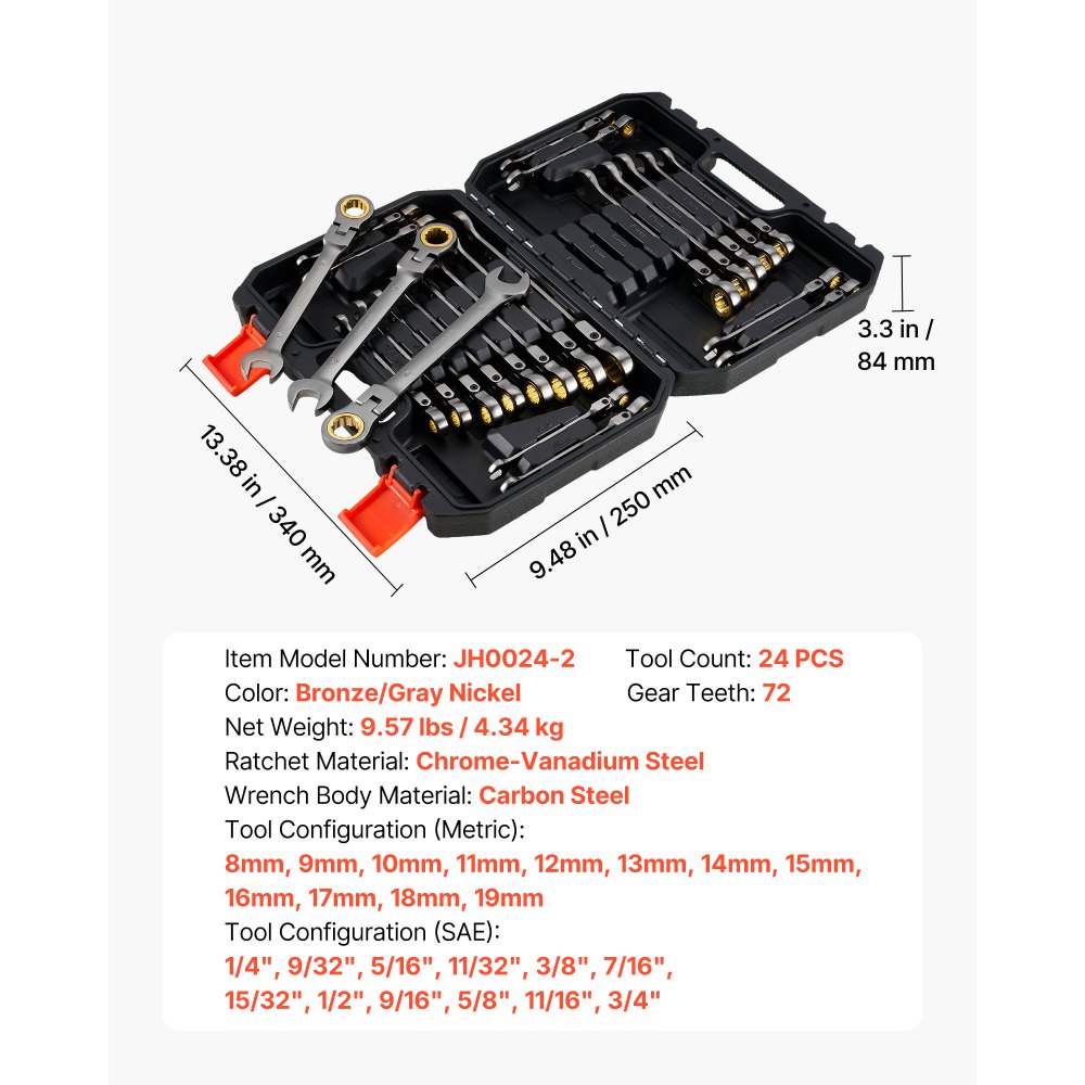Gama completa de tamaños para reparaciones diarias: Nuestro juego de llaves de trinquete flexibles de 24 piezas incluye llaves métricas de 8-9 mm y de SAE de 1/4"-3/4", proporcionando los tamaños comunes para trabajos automotrices, mantenimiento del hogar, ensamblaje de maquinaria y proyectos de bricolaje