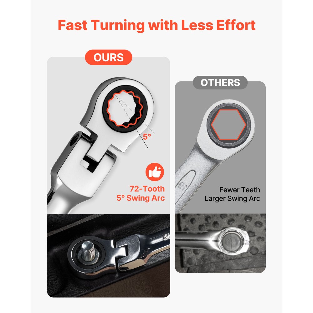 Giro suave para un trabajo rápido: La carraca de 72 dientes y el diseño de microoscilación de 5° reducen el movimiento de la mano para un control suave en espacios reducidos. Este juego de llaves de carraca cuenta con un agarre antideslizante y un engranaje preciso para un giro más fácil e ininterrumpido