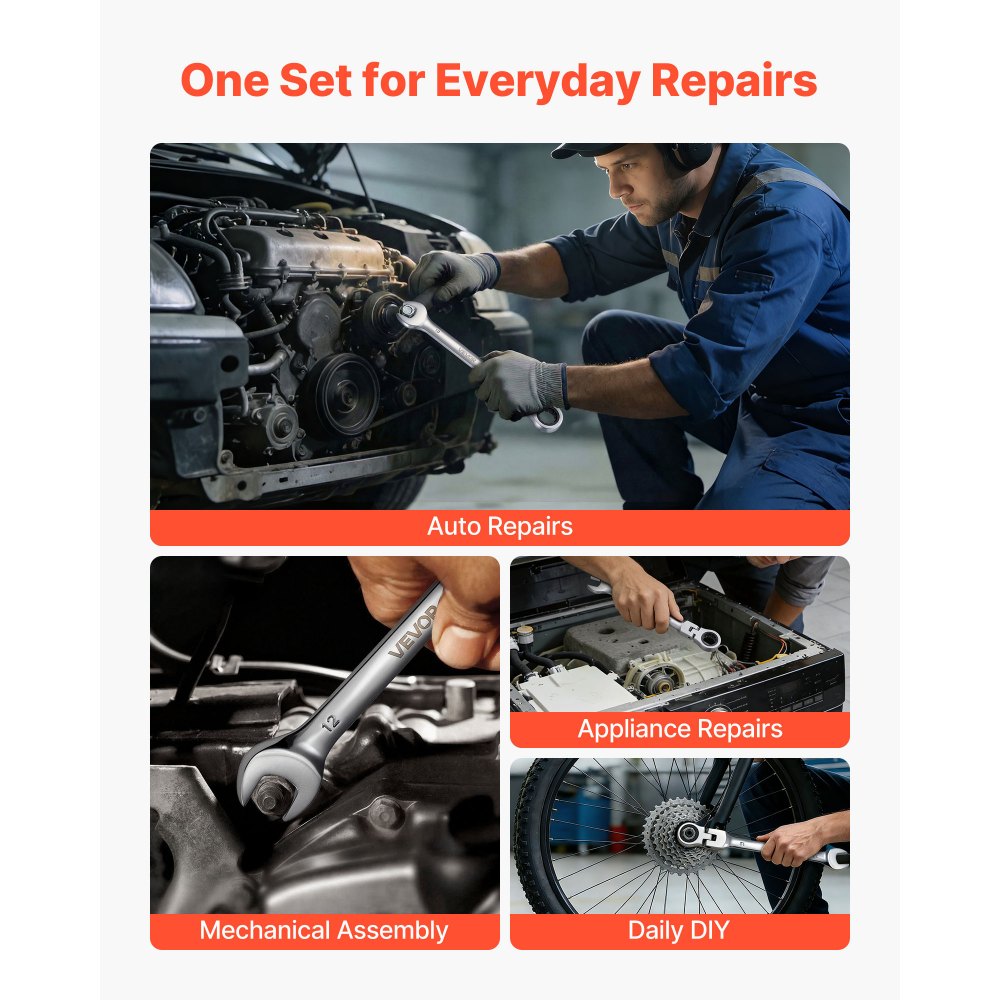 Diseñado para un uso diario duradero: Este juego de llaves de trinquete está fabricado con un cuerpo de acero reforzado y una cabeza de trinquete de acero cromo vanadio para mayor resistencia y fiabilidad. El acabado antioxidante garantiza un rendimiento fiable incluso en entornos húmedos o aceitosos