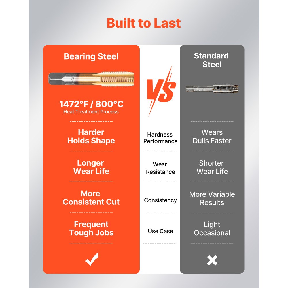 Compatible con múltiples metales: Estos machos y terrajas funcionan con acero al carbono, hierro fundido, aleaciones de aluminio, latón, cobre y acero inoxidable, lo que los hace ideales para reparaciones de garaje, tareas de taller y una amplia gama de aplicaciones