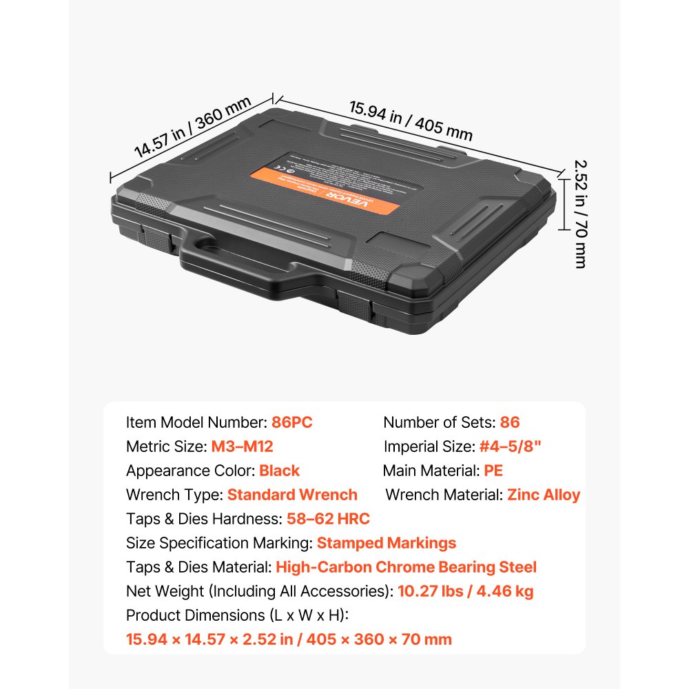 Juego SAE y métrico de 86 piezas: Este juego de machos y terrajas satisface las necesidades comunes de roscado interno y externo, lo que lo hace ideal tanto para el corte de roscas nuevas como para la reparación de roscas dañadas, sin necesidad de juegos de herramientas adicionales