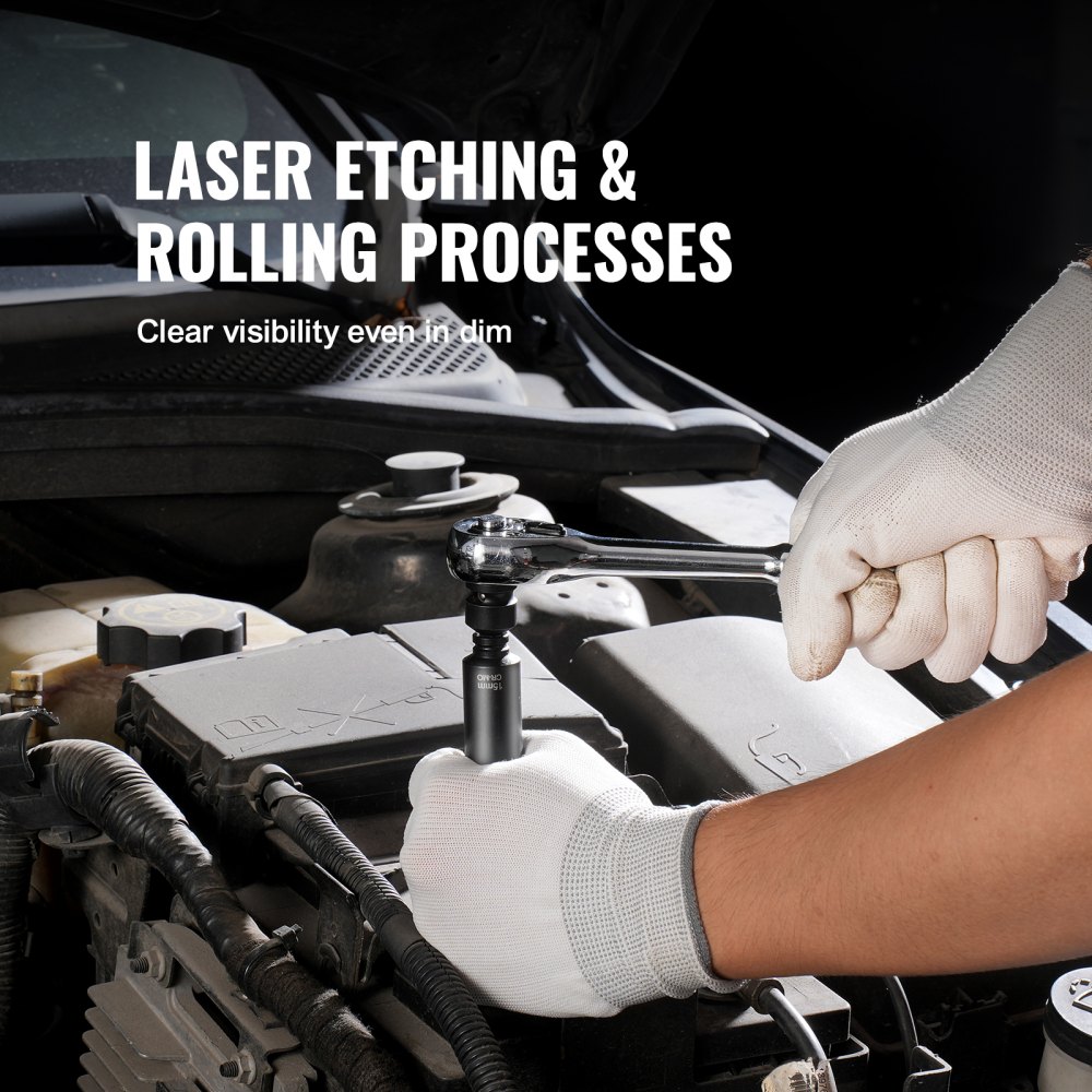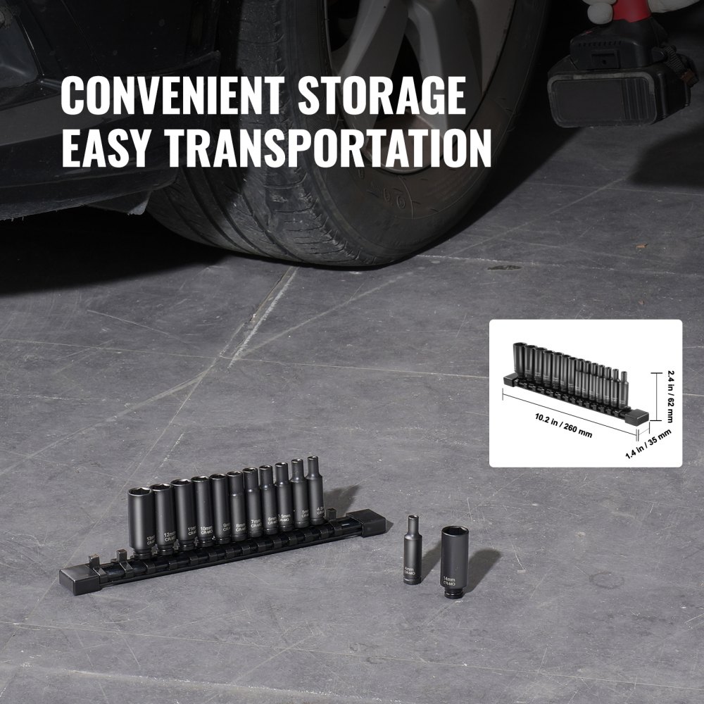 Marcas de tamaño fáciles de leer: Las marcas de tamaño en este juego de vasos para llave de impacto de 14 piezas están cuidadosamente grabadas y enrolladas con láser, lo que hace que los tamaños de vasos sean fáciles de ver incluso en condiciones de poca luz.