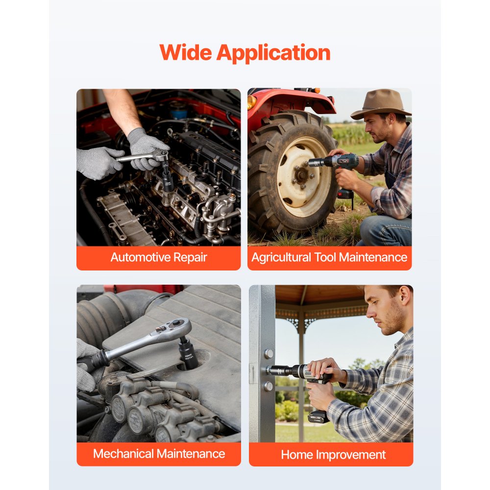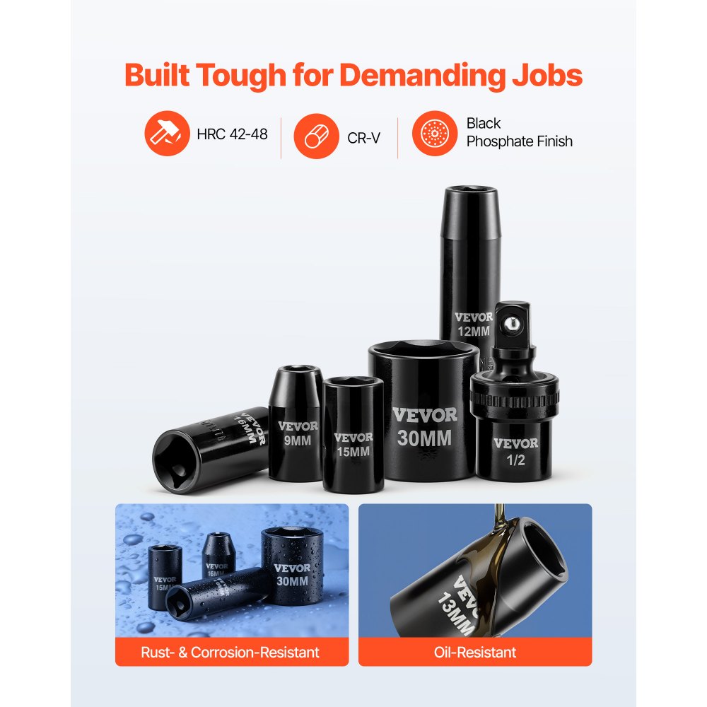 Durabilidad sin concesiones: Fabricado con acero aleado CR-V de primera calidad y tratado térmicamente para mayor resistencia, este juego de vasos de impacto soporta un alto par de apriete sin sufrir daños. El acabado de fosfato negro ofrece protección contra el agua, el aceite y la corrosión