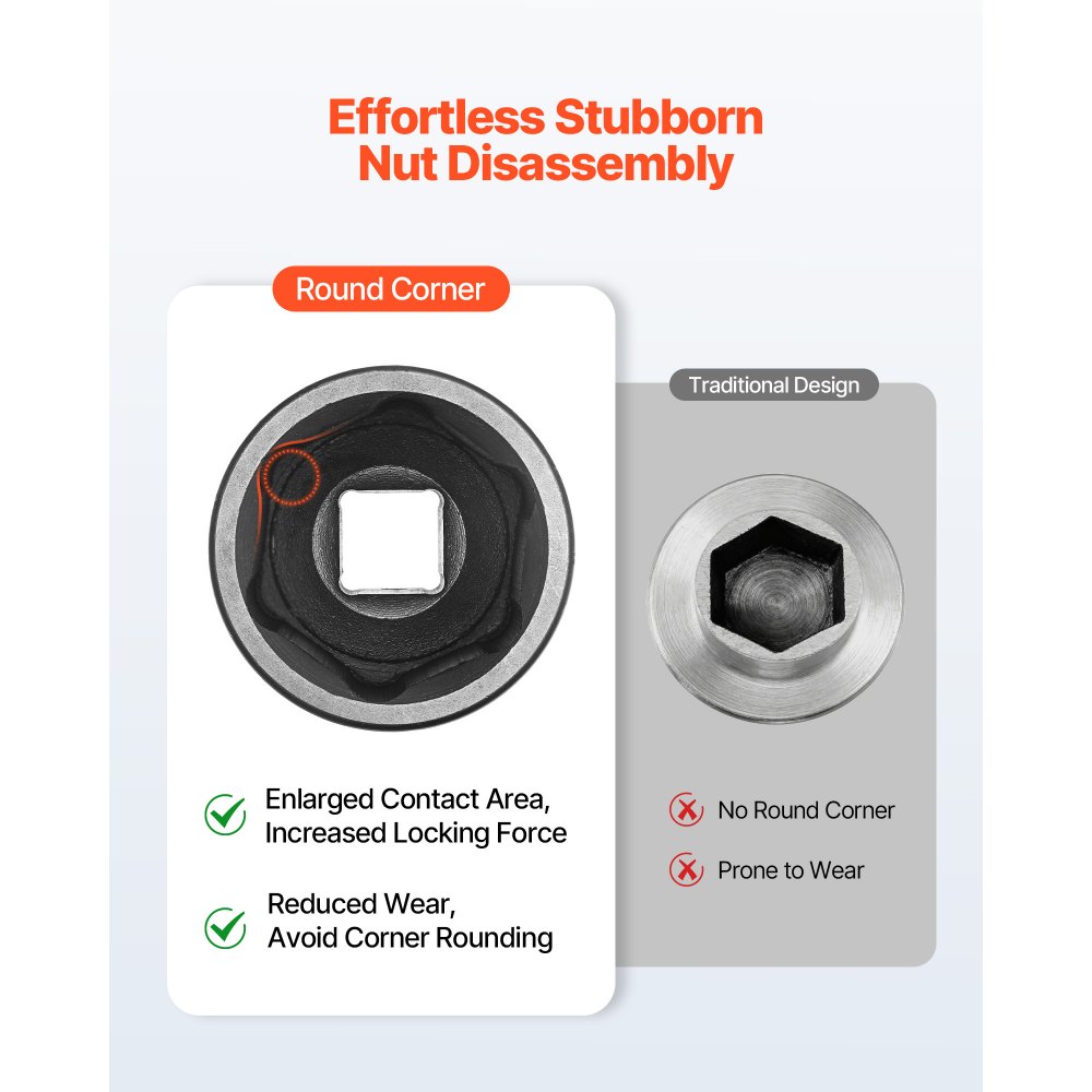 Mayor eficiencia en las reparaciones: El diseño de 6 puntas del dado aumenta la superficie de contacto con los tornillos para un mejor agarre. Esto reduce el desgaste, evita que se redondeen las esquinas y garantiza que los tornillos permanezcan en su lugar, incluso al usar llaves de impacto de alto torque