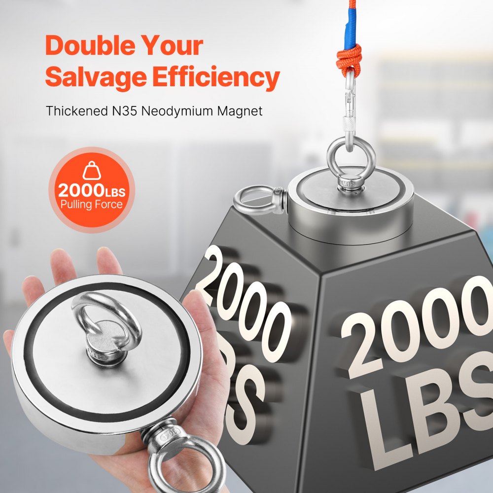 Imán fuerte de doble cara: fabricado con material de neodimio N35 de primera calidad, el diseño del imán de pesca de doble cara mejora en gran medida la funcionalidad, proporcionando una fuerza de tracción máxima de hasta 2000 LBS / 907 Kg. Puede recuperar fácilmente las llaves caídas o los tesoros submarinos.