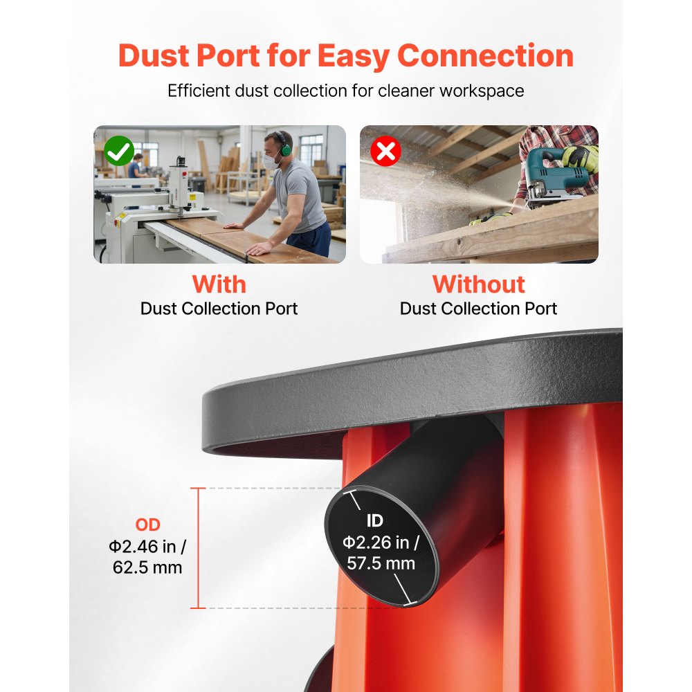 Funcionamiento sin polvo: Equipada con un puerto para polvo con un diámetro interior de 57,5 mm y un diámetro exterior de 62,5 mm, nuestra lijadora de husillo se puede conectar fácilmente a las mangueras de la aspiradora para absorber el polvo de manera eficiente, reducir el esfuerzo de limpieza y mantener su lugar de trabajo más limpio