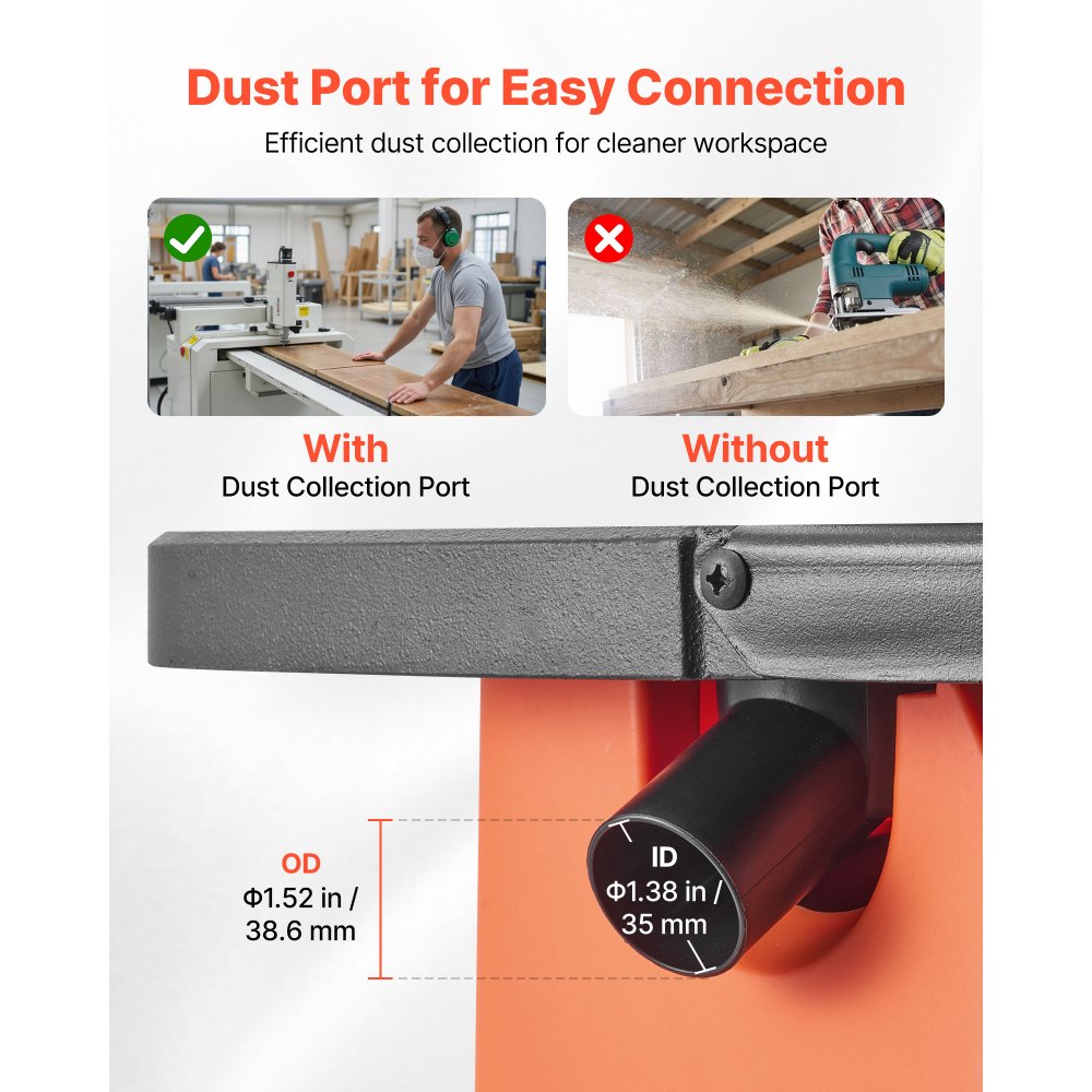 Operación sin polvo: Equipada con un puerto de polvo de 35 mm de diámetro interior y 38,6 mm de diámetro exterior, nuestra lijadora de husillo de banda se puede conectar fácilmente a las mangueras de la aspiradora para absorber el polvo de manera eficiente, reducir el esfuerzo de limpieza y mantener su lugar de trabajo más limpio