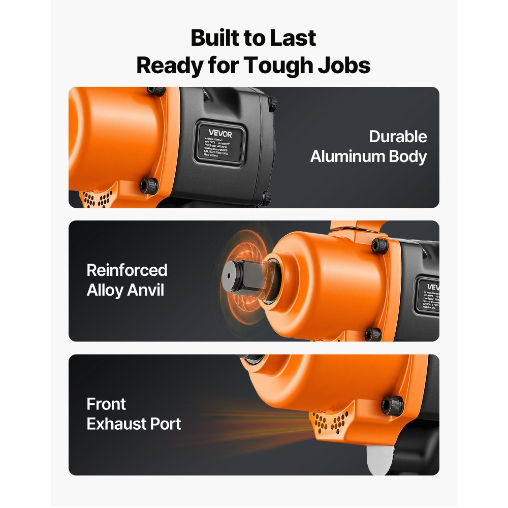 Resistente y duradera: La carcasa de aleación de aluminio y el yunque de aleación reforzada proporcionan resistencia a la llave neumática para trabajos exigentes. Recuerde aplicar aceite lubricante(no incluido) antes de usar