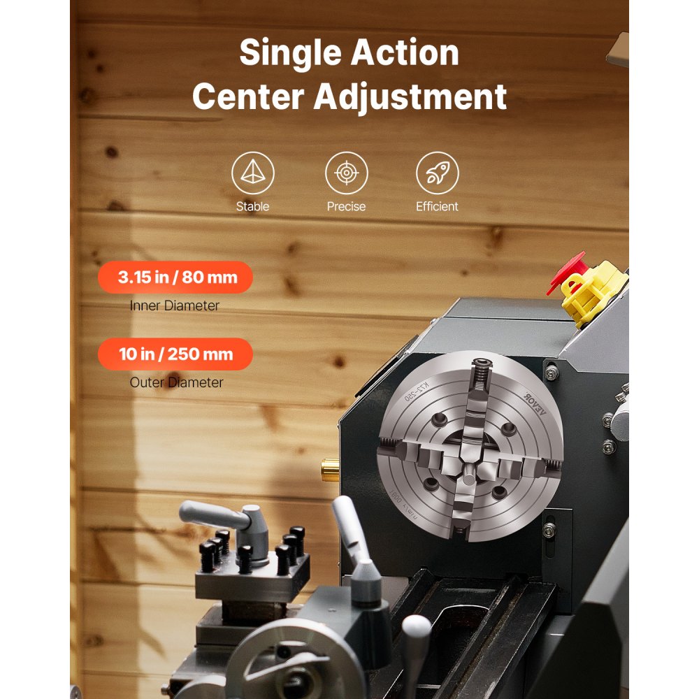 Mandril de torno de 4 mordazas de 10 pulgadas: Con un diámetro interior de 80 mm y un diámetro exterior de 250 mm, este mandril de torno sujeta piezas de trabajo que van desde 15 a 250 mm, lo que lo hace ideal para una amplia variedad de tamaños de piezas de trabajo