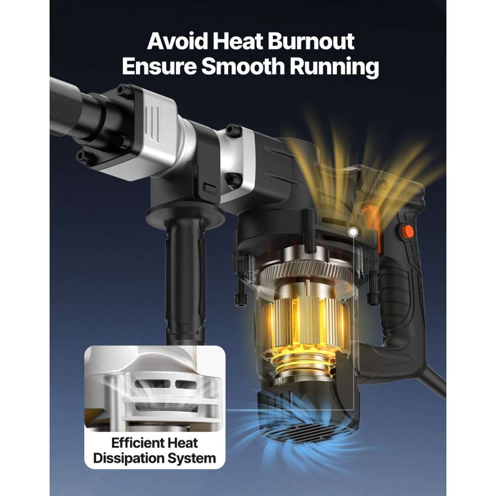Se mantiene fresco durante el trabajo intenso: El eficiente sistema de enfriamiento enfría efectivamente el motor para mejorar la vida útil del rompedor de concreto. ¡El motor estará a bajas temperaturas incluso después de un duro día de trabajo!