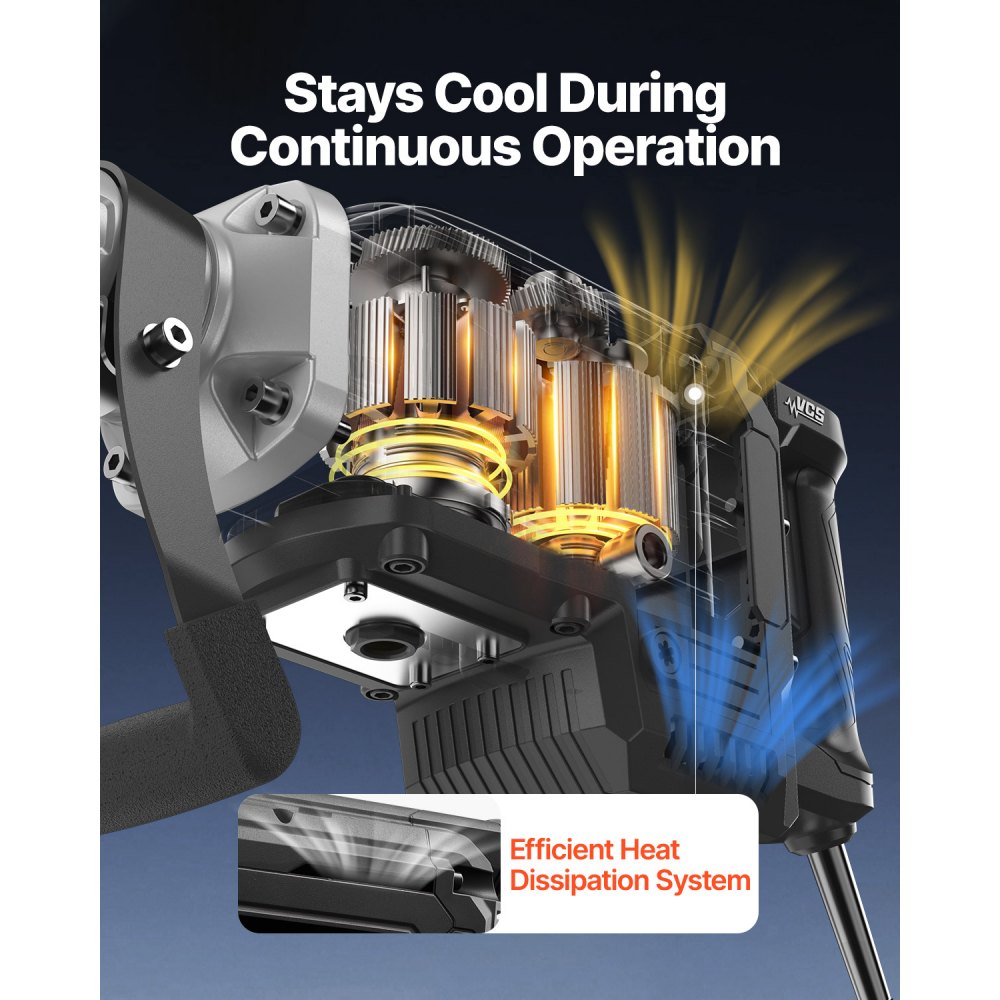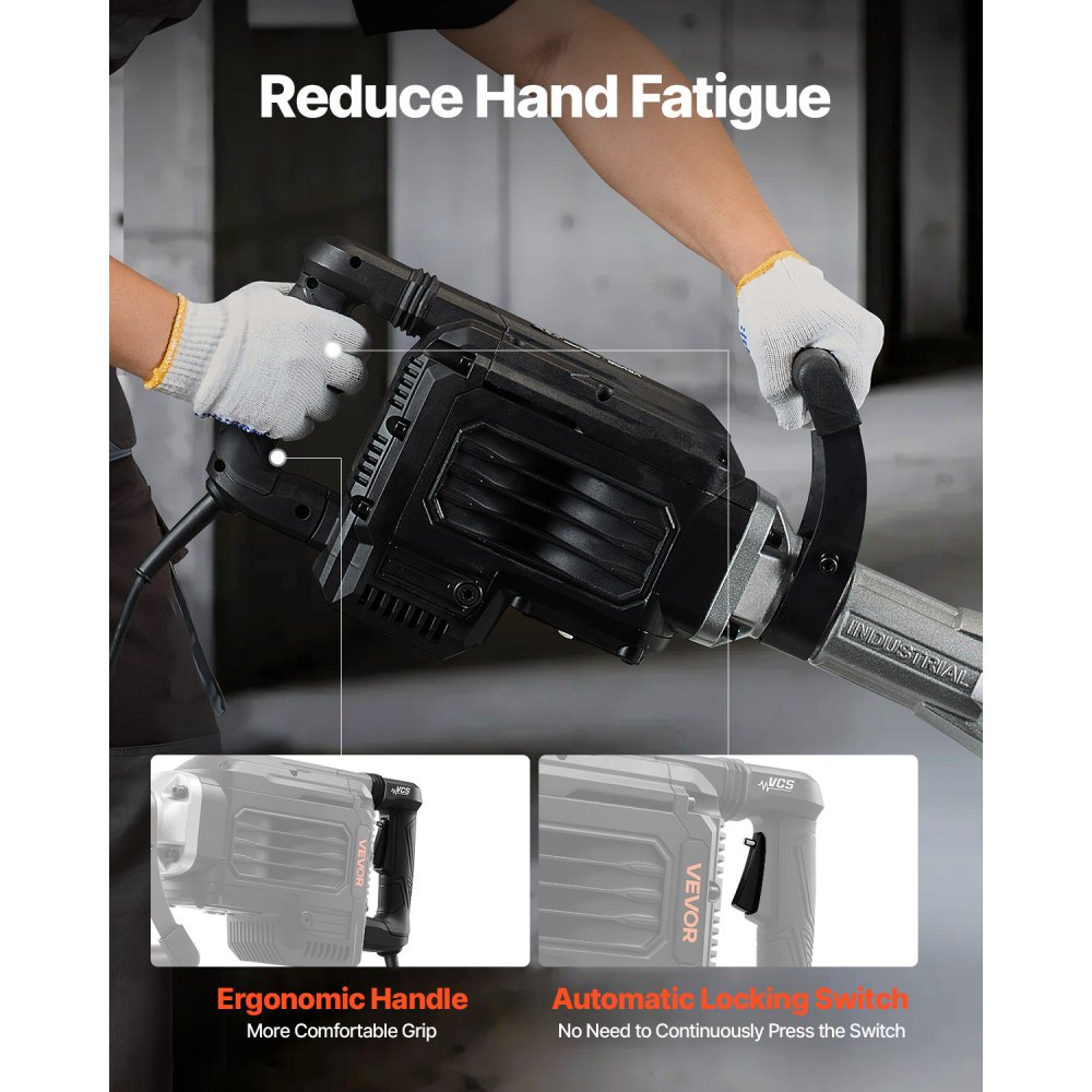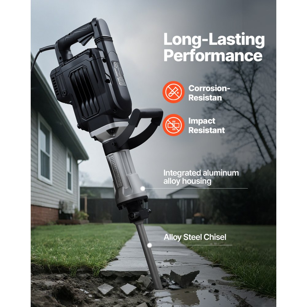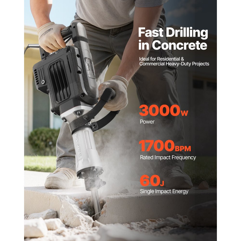 Motor de alto rendimiento: Impulsado por un motor de 3000 W con hasta 1700 BPM, este martillo demoledor maneja tareas pesadas de manera rápida y eficiente, ideal para uso doméstico y proyectos comerciales