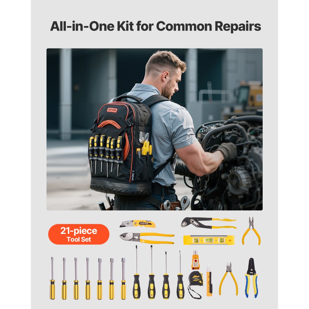 Mochila para Herramientas, Mochila de Trabajo 370 x 195 x 520 mm con 65 Bolsillos, Compartimento para Portátil, Base Moldeada y Herramientas de 21 Piezas para Electricistas, Reparadores - Herramientas manuales