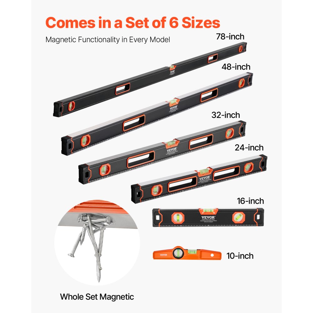 Juego completo magnético: Nuestros niveles de torpedo magnéticos están disponibles en longitudes de 10, 16, 24, 32, 48 y 78 pulgadas. Todo el juego está equipado con funcionalidad magnética, lo que le permite colocar los niveles de forma segura en superficies metálicas para realizar mediciones convenientes