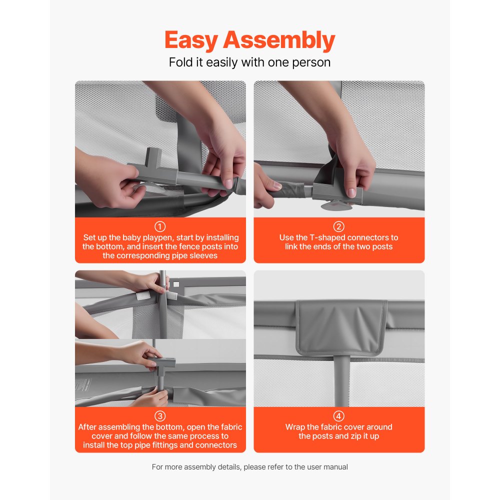 Fácil de montar y almacenar: Esta valla de juego para bebés y niños pequeños puede ser montada rápidamente por una sola persona y viene con una bolsa de almacenamiento para facilitar su transporte y almacenamiento compacto cuando no está en uso, ahorrando espacio y brindando mayor comodidad