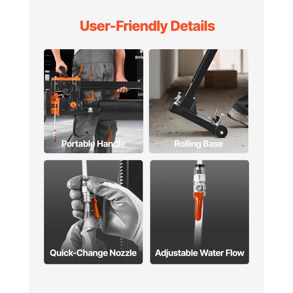 Fabricada para durar: Fabricada con un cuerpo de aluminio ligero pero resistente, esta perforadora resiste el desgaste. Cuenta con ruedas para facilitar su transporte. La manguera de agua de PVC es resistente a las grietas y el eje de salida de acero proporciona una precisión constante
