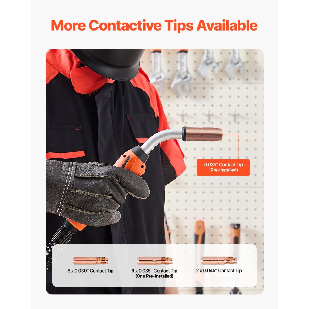Abundantes puntas de contacto: Preinstalado con una punta de contacto de 0,035", el paquete también incluye 8 puntas adicionales de 0,030", 8 puntas de 0,035" y 2 puntas de 0,045", lo que permite reemplazos rápidos y versatilidad en diversas tareas de soldadura