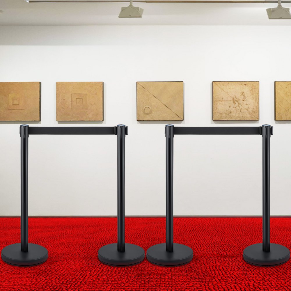 Postes Separadores 4 Piezas Altura 90 cm Negros Poste Separador con Cinta Extensible de 2 m Negra Conexión de 4 Vías 22 kg Postes de Barrera de Control de Multitudes Retráctiles Base Estable - Herramientas manuales